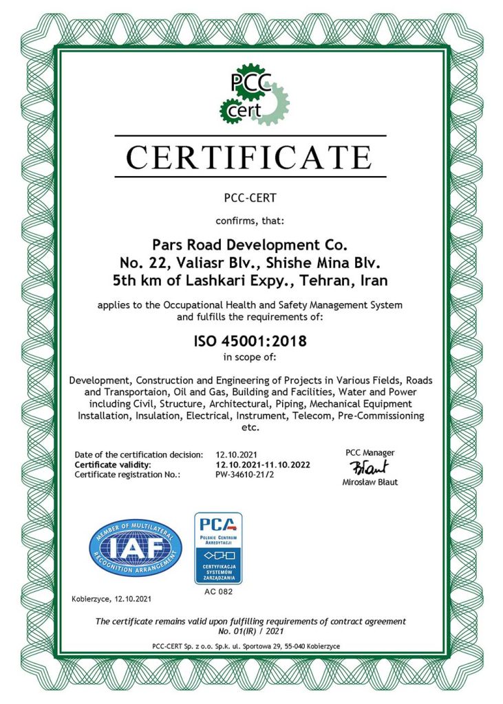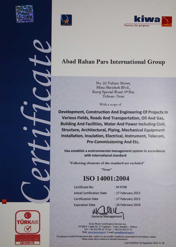 Abad Rahan Pars International Group has the following Contractor Qualification Certificates:
